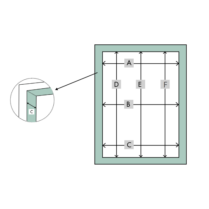 Measure the window frame at Top A, middle B, and Bottom C. Pick the smallest measurement.